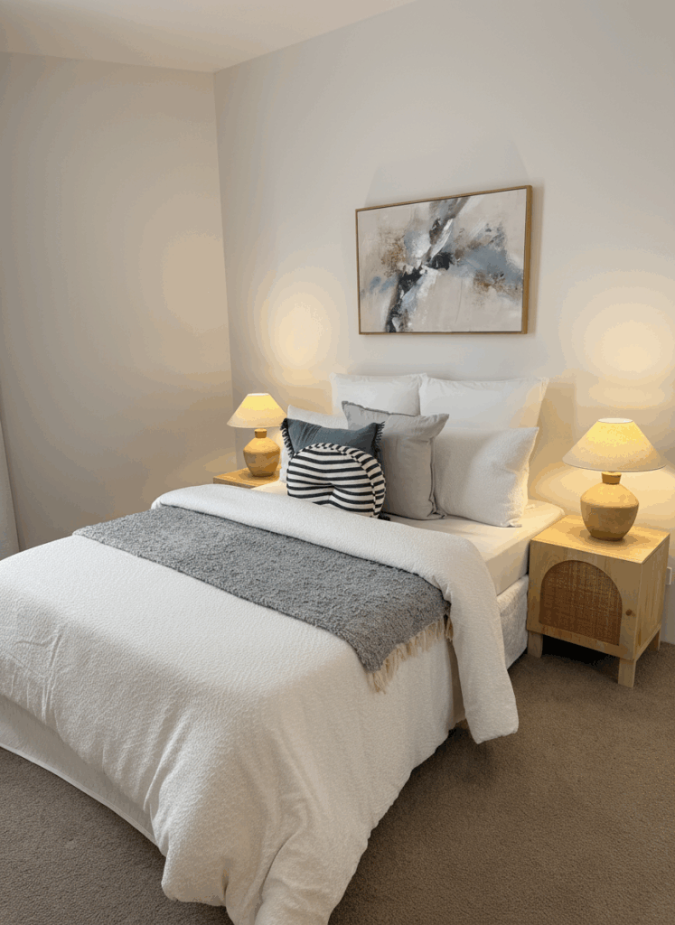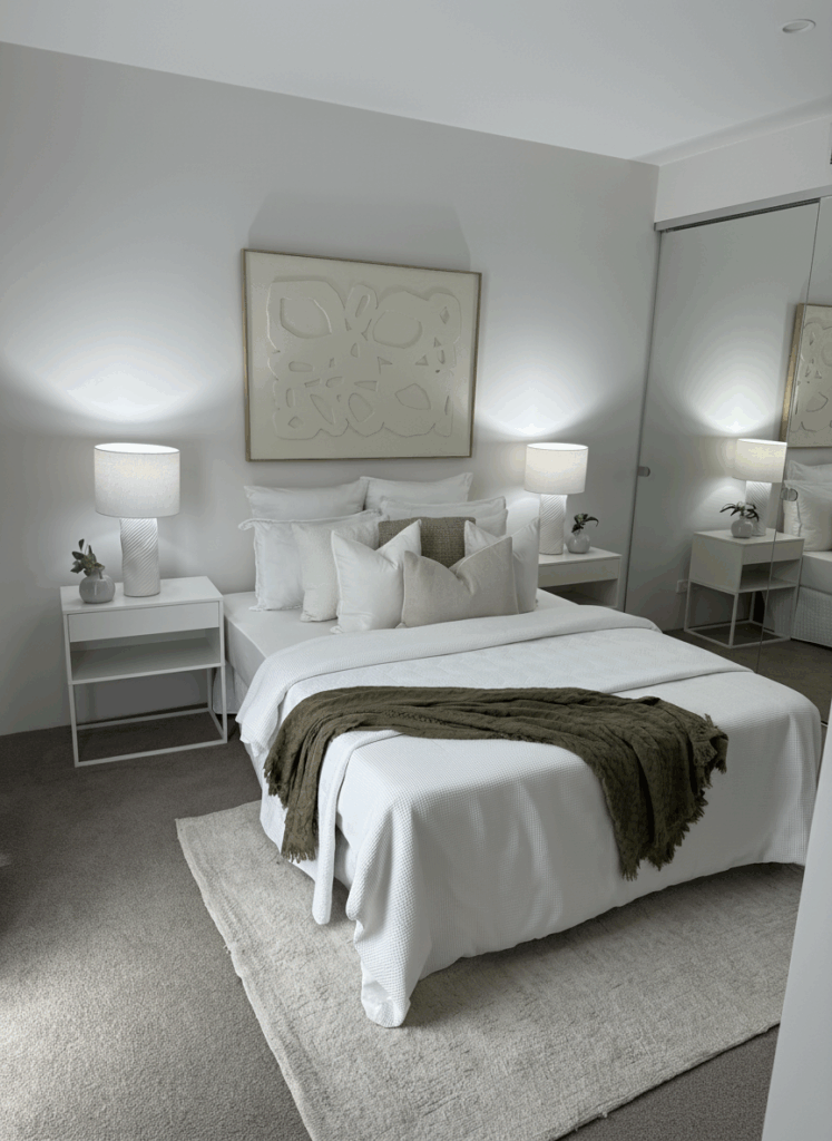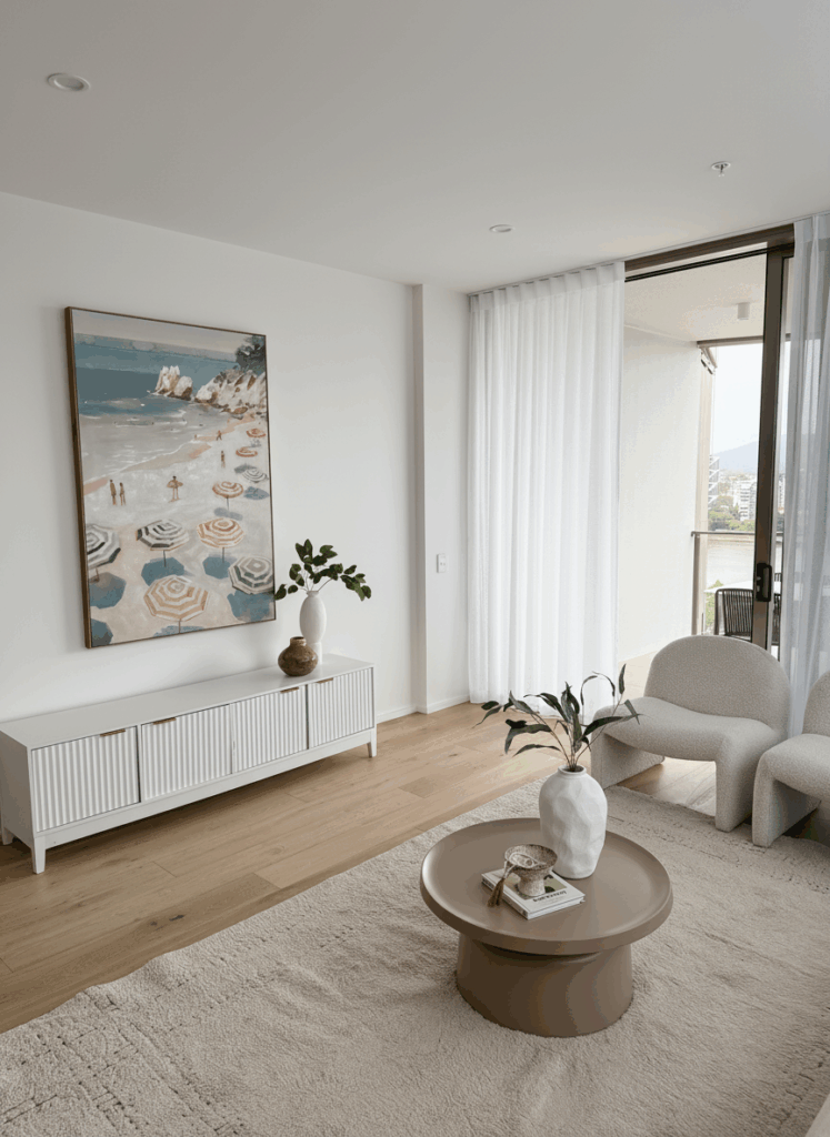 This project is designed to do exactly what great presentation should, help buyers instantly imagine a better version of everyday living. The soft, neutral palette creates broad appeal, while the layered textures and gentle curves add warmth without overwhelming the room. Natural light is maximised to make the space feel open and uplifting, and each furniture placement guides the eye through the room, subtly defining zones while maintaining flow. It’s styled to look beautiful and emotionally connect with the property from the moment the buyer walks in.