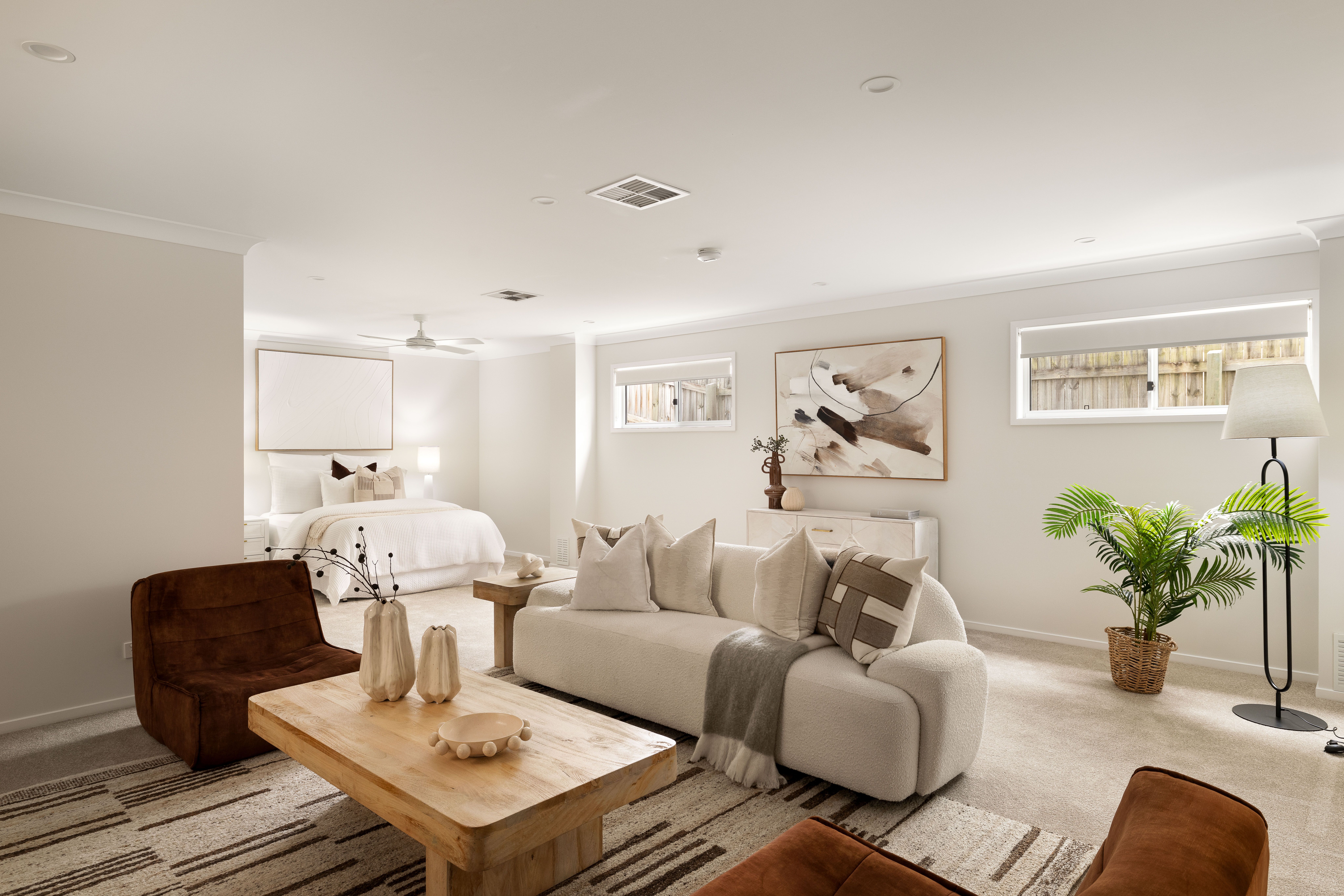 Package includes beds linen, wall art, cushions, floor rugs, accessories and greenery.